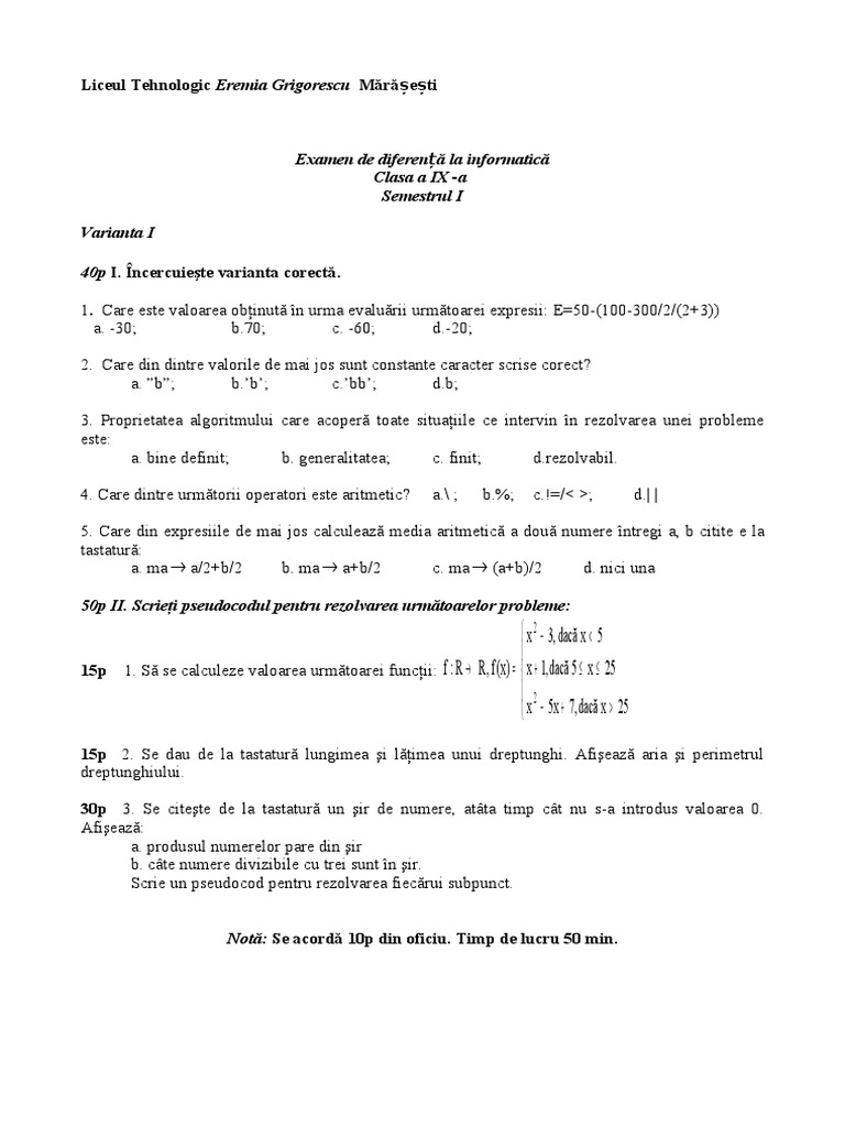 Examen Diferenta Info Sem I Clșasa A Ix A