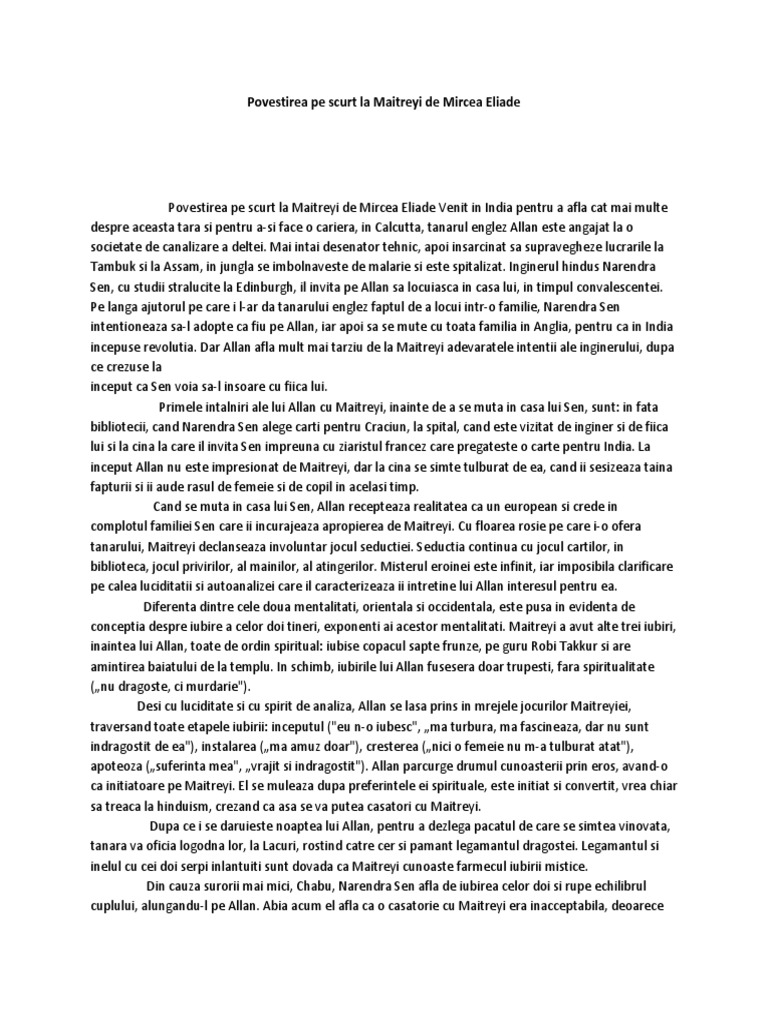 Maitreyi schema eseului de apartenenta la specie. Maitreyi se extaziaza de dragostea pentru pomul ei numit 7 frunze ii da lui allan flori presate. Povestirea pe scurt la maitreyi de mircea eliade referate povestirea pe scurt la maitreyi de mircea eliade venit in india pentru a afla cat mai multe despre aceasta tara si pentru a si face o cariera in calcutta tanarul englez allan este angajat la o societate de canalizare a deltei. Maitreyi este o opera a lui mircea eliade pe scurt despre relatii dintre oameni din locuri si culturi diferite.