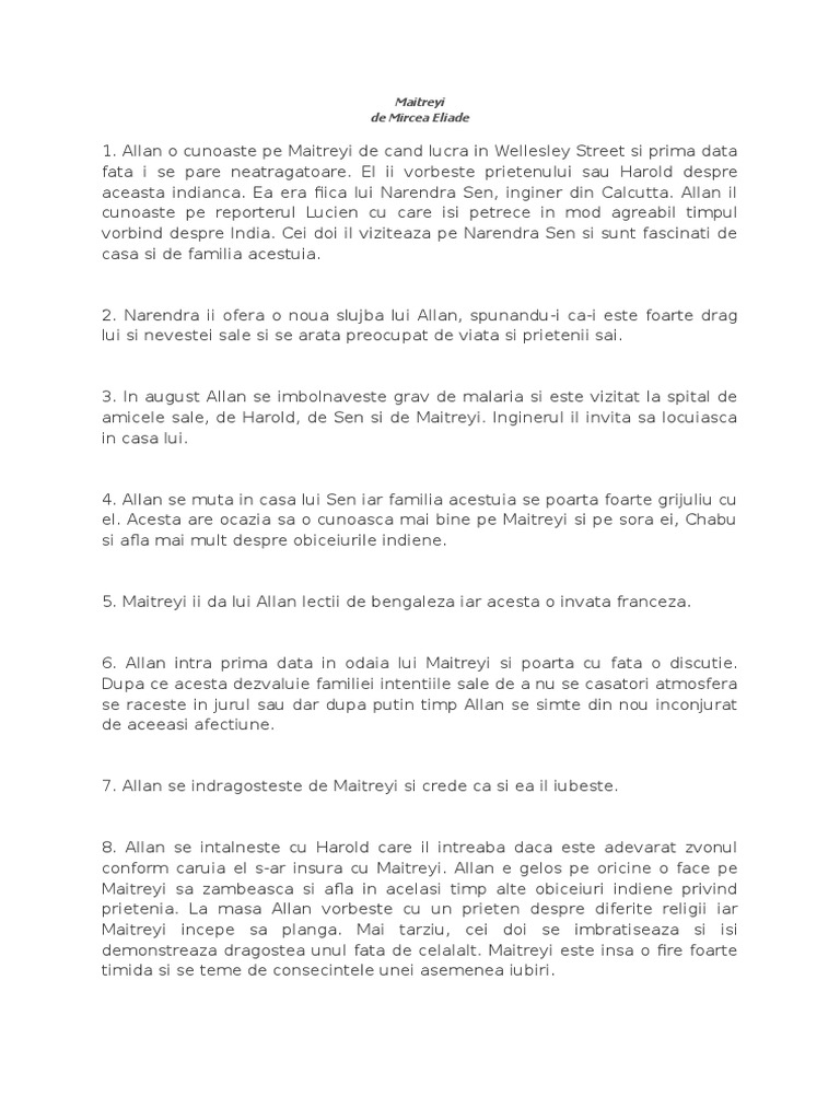 Referat despre maitreyi allan o cunoaste pe maitreyi de cand lucra in wellesley street si prima data fata i se pare neatragatoare. Povestirea pe scurt la maitreyi de mircea eliade referate povestirea pe scurt la maitreyi de mircea eliade venit in india pentru a afla cat mai multe despre aceasta tara si pentru a si face o cariera in calcutta tanarul englez allan este angajat la o societate de canalizare a deltei maitreyi de mircea eliade rezumat maitreyi de mircea. Mircea eliade maitreyi rezumat pe momentele subiectului. Pe de alta parte tanara este inteligenta si cultivata pe englez surprinzandu l seriozitatea ei de a tine conferinte cu teme profunde la care vine un auditoriu elevat.