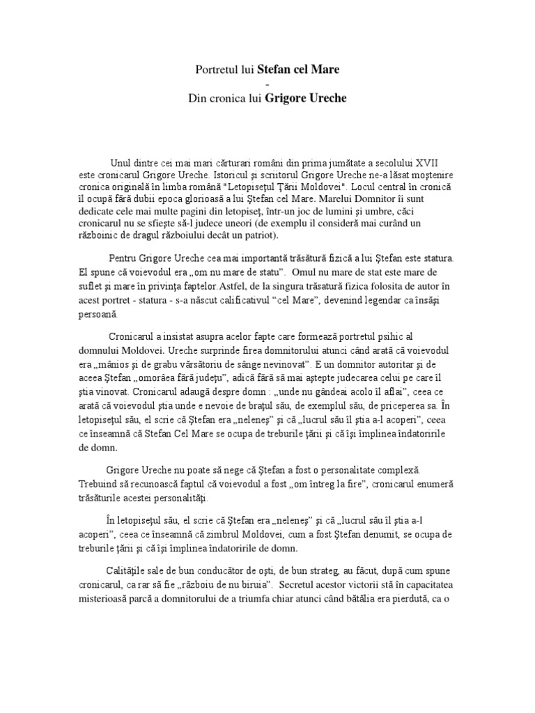 Portretul Lui Stefan Cel Mare In Cronica Lui Grigore Ureche