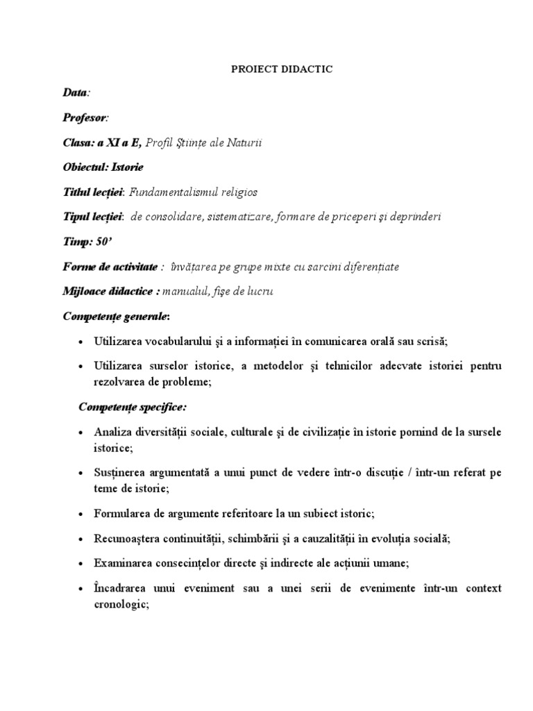 Fundamentalismul Religios Proiect De Lectie Clasa A Xi A