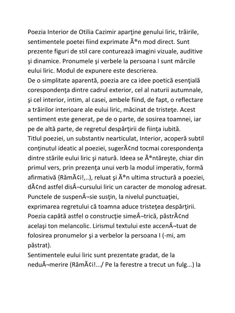 Poezia Interior De Otilia Cazimir Aparţine Genului Liric
